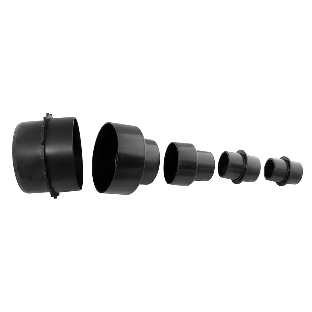 - Includes 5 plastic nested fittings for dust hoses 4” to 1-3/8” diameter