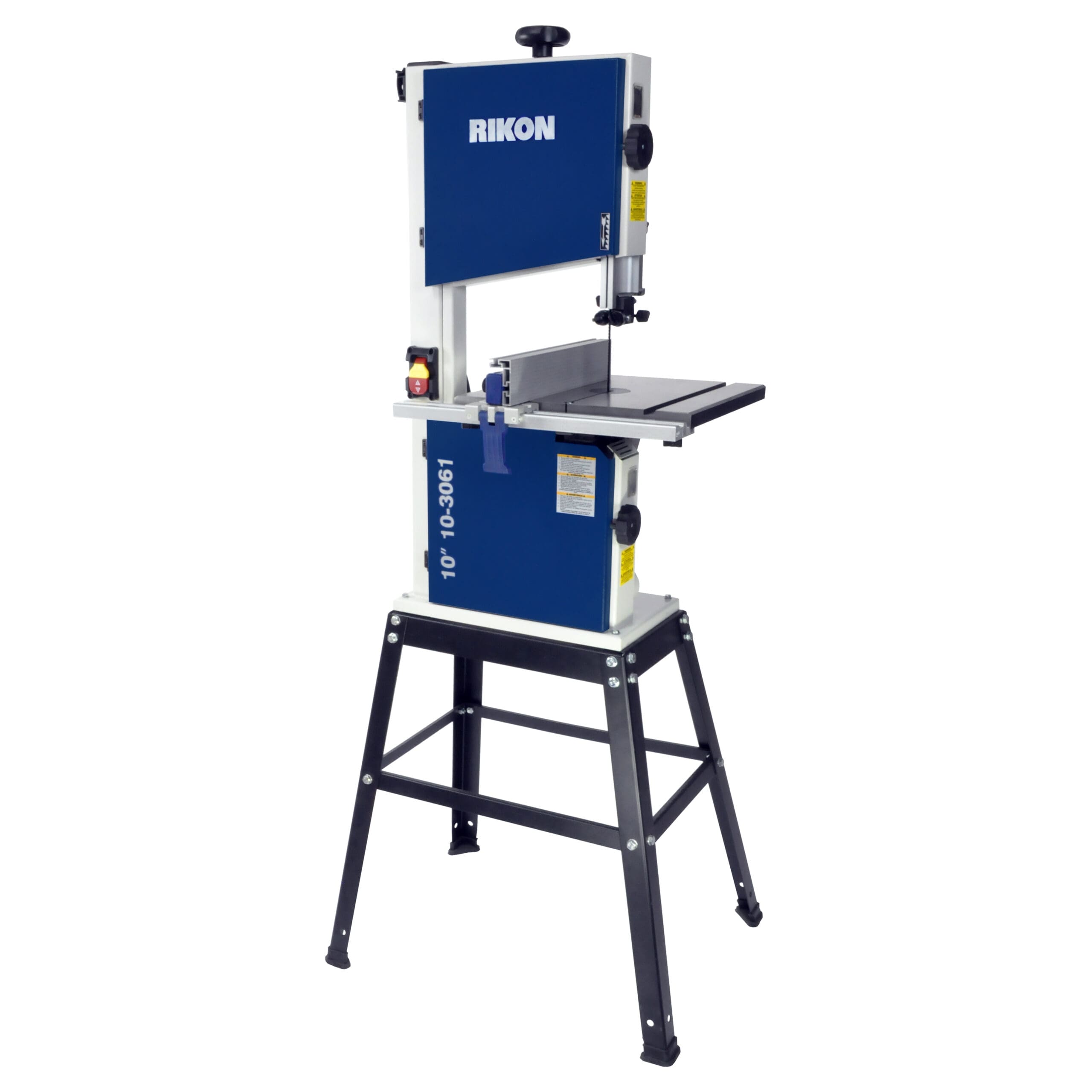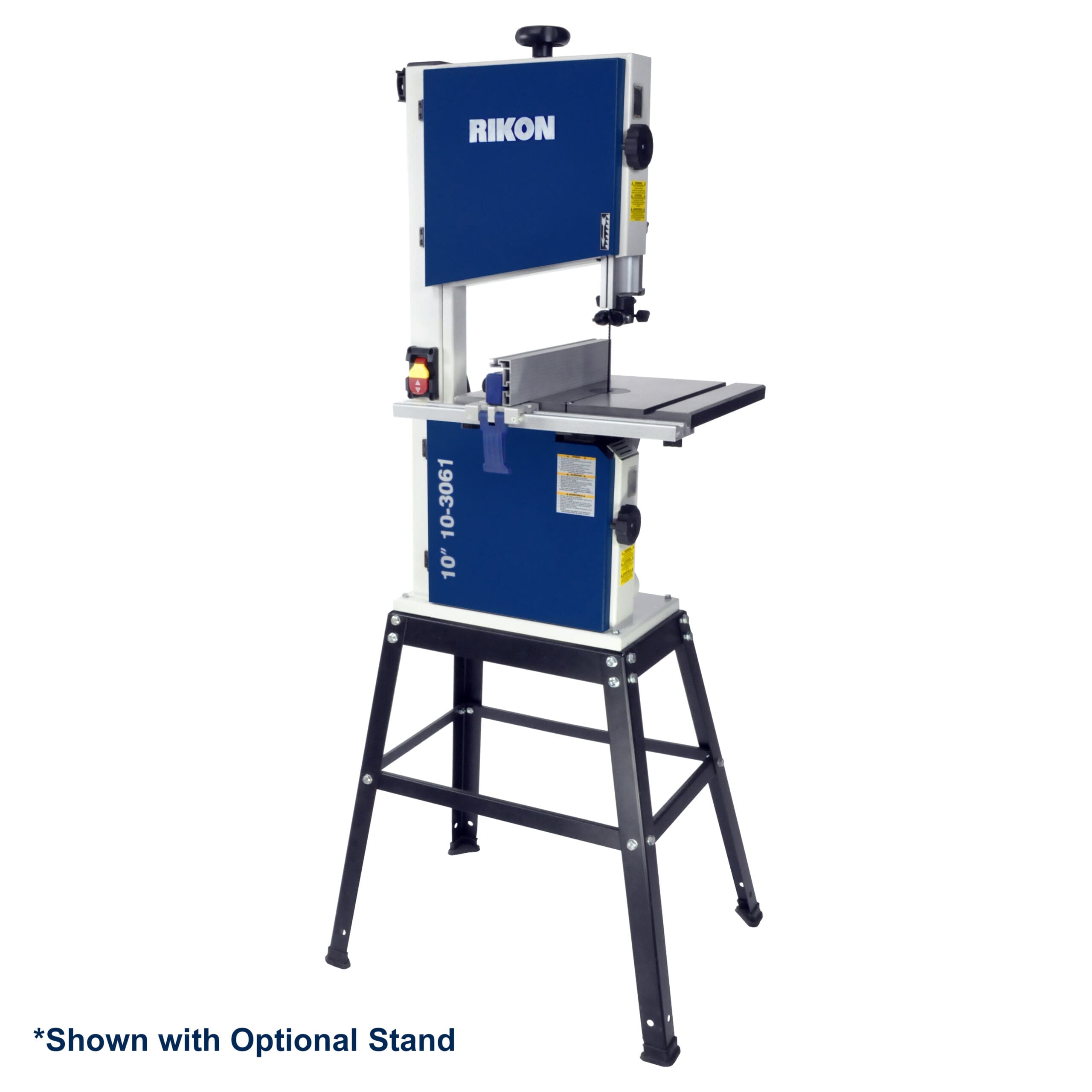 The new and improved 10” Bandsaw 10-3061 is a replacement of our previous 10-306 model. Numerous features make this bandsaw extremely easy to operate and make adjustments to the blade, guides and fence. The increased cutting capacity, 2 blade speeds, and increased 1/2HP motor are quite ample enough for smaller projects, and will be appreciated by woodworkers having limited shop space for a larger size bandsaw. Improved features for easy operation – 2 blade speeds, tool-less blade guides, quick-release blade tension lever, tilting 0-45° cast iron table, adjustable rip fence, larger blade tension knob, dust port for shop vacuum hookup, side windows for viewing blade tracking settings, storage hanger for the fence and tools, and safety paddle on/off switch. Reduced size is ideal for transporting, or storing, when not in use. Includes rip fence. Steel stand is available separately.