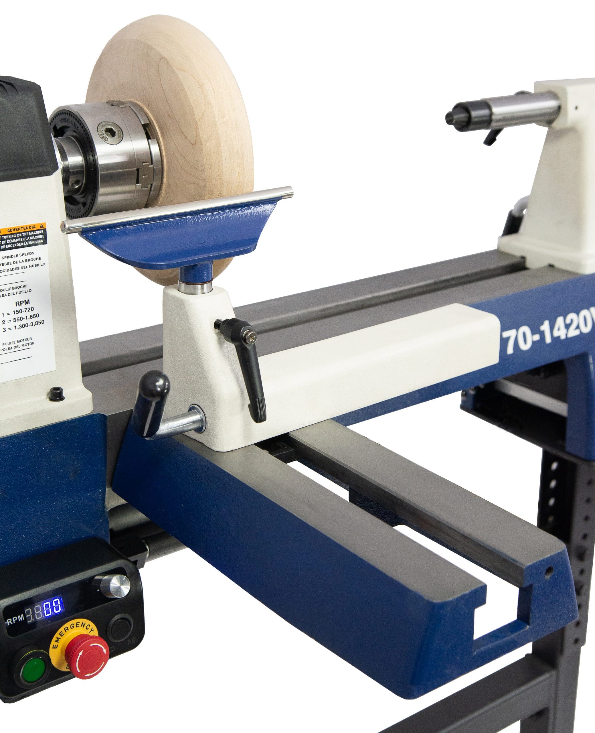 14” X 20” VARIABLE SPEED MIDI LATHE 70-1420VSR is the largest benchtop lathe in the RIKON line of machinery. This upgraded model gives woodturners increased spindle-to-bed height so that larger diameter work can be done. The addition of 3 machined surfaces to mount optional extensions increase the working dimensions even further.