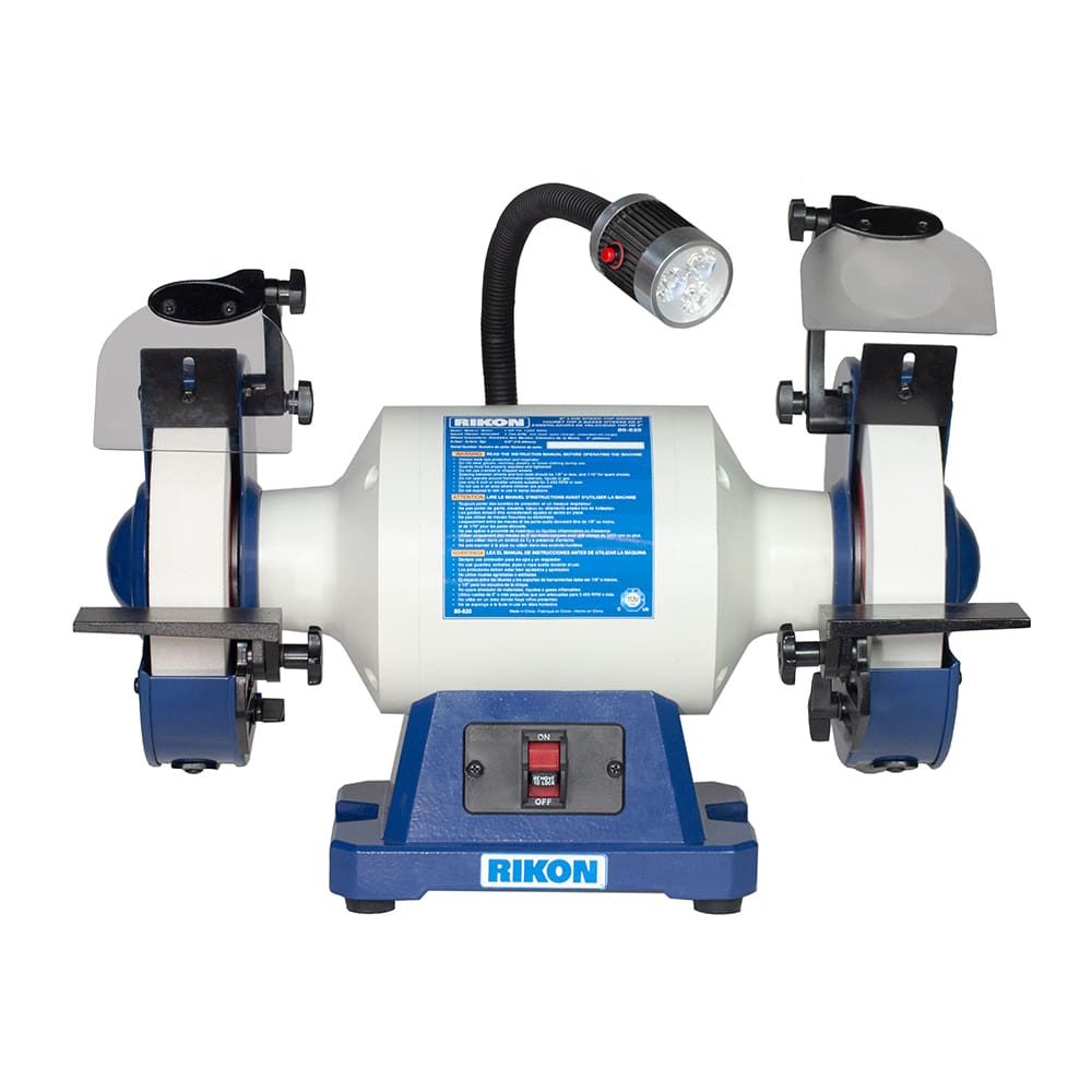 1 HP LOW SPEED BENCH GRINDER 80-820 has a larger size motor that will tackle the tough grinding jobs which are typical in production shops, as well as the finesse shaping and sharpening of hand tools. Wide 1-1/2” wheels provide greater surface area to reduce heat build-up. Tool rests on this machine are extra-large and flat, without a drill bit sharpening groove. Wheel flanges are cast metal. Grinder includes 1-1/4” O.D. dual dust collection ports on the rear of the wheel guards, and eye shields with 2.5x magnification for close-up inspection of your edges being ground.